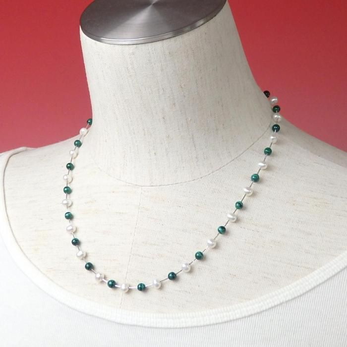 シルバーチェーンにグリーンのマラカイトと淡水パールを通したモダンなステーションネックレスです。
