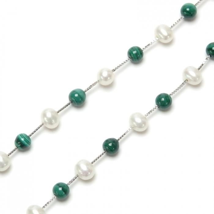 素材:マラカイト(約4.5mm)、淡水パール(約4mm)、シルバーチェーン(ベネチアンタイプ)