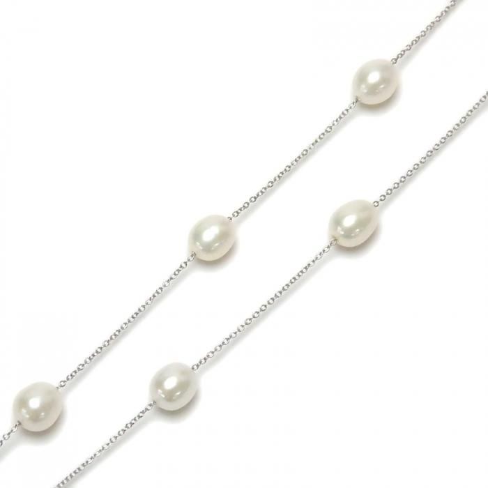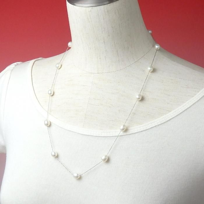 シルバーチェーンに大粒淡水パールを通したスタイリッシュなステーションロングネックレスです。