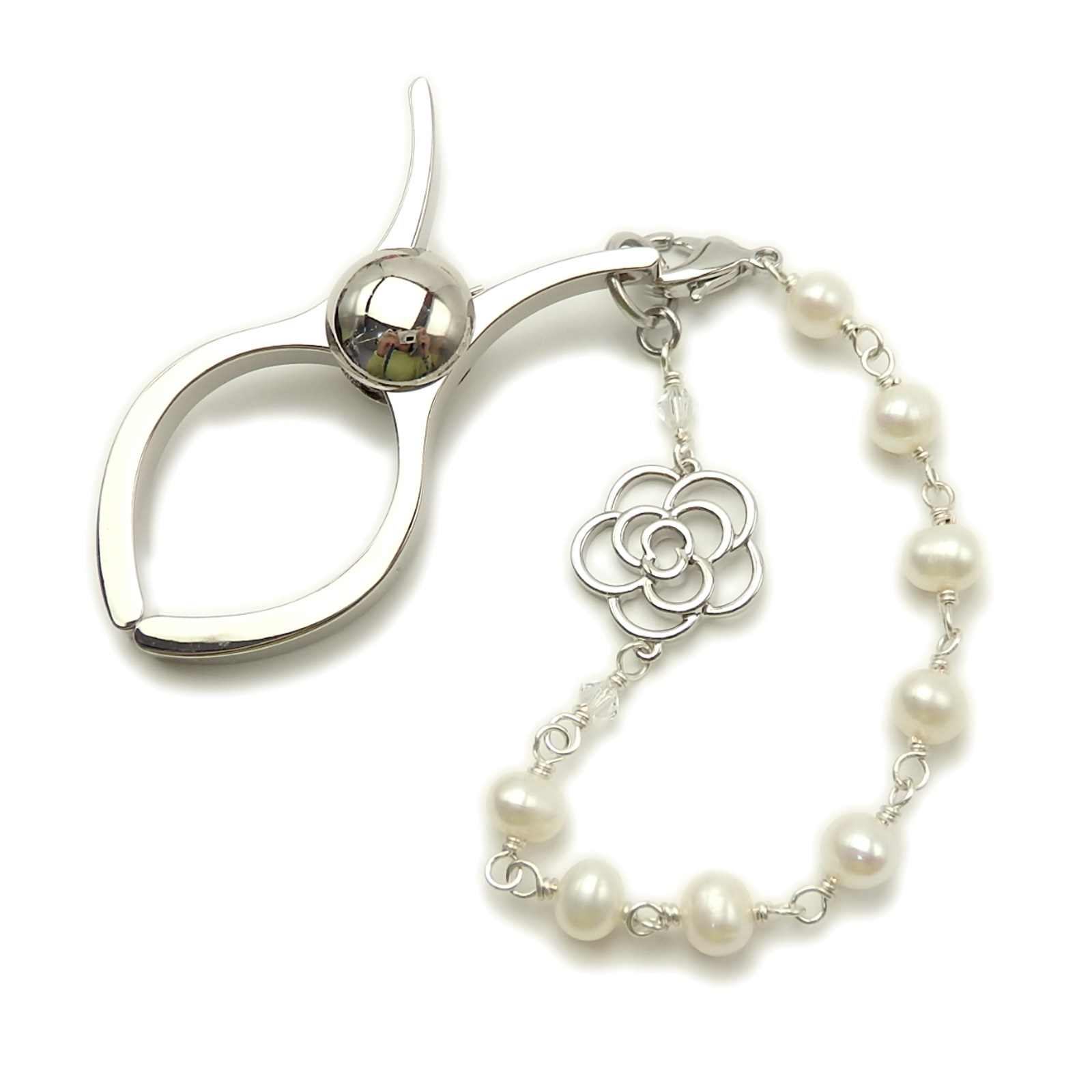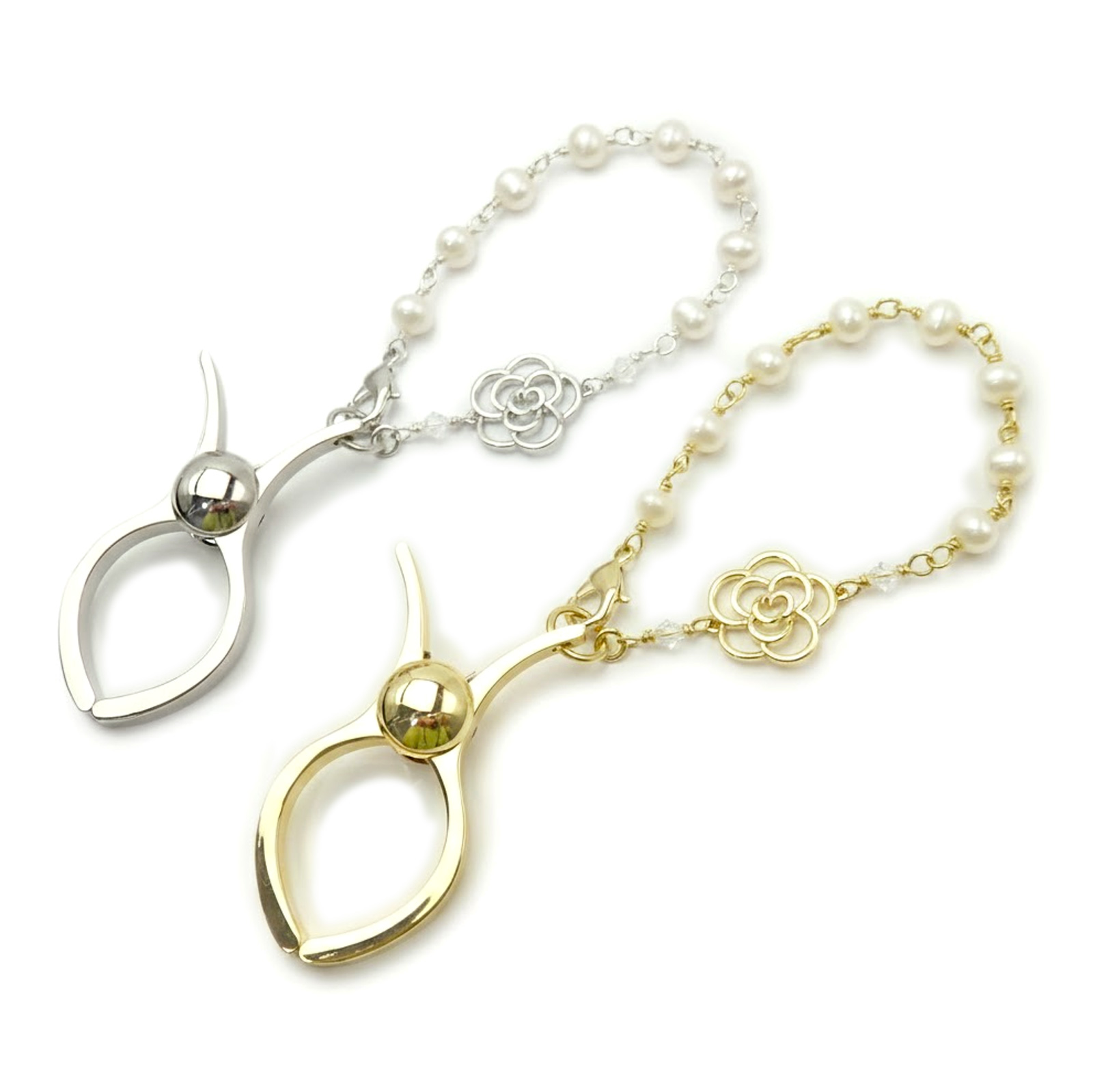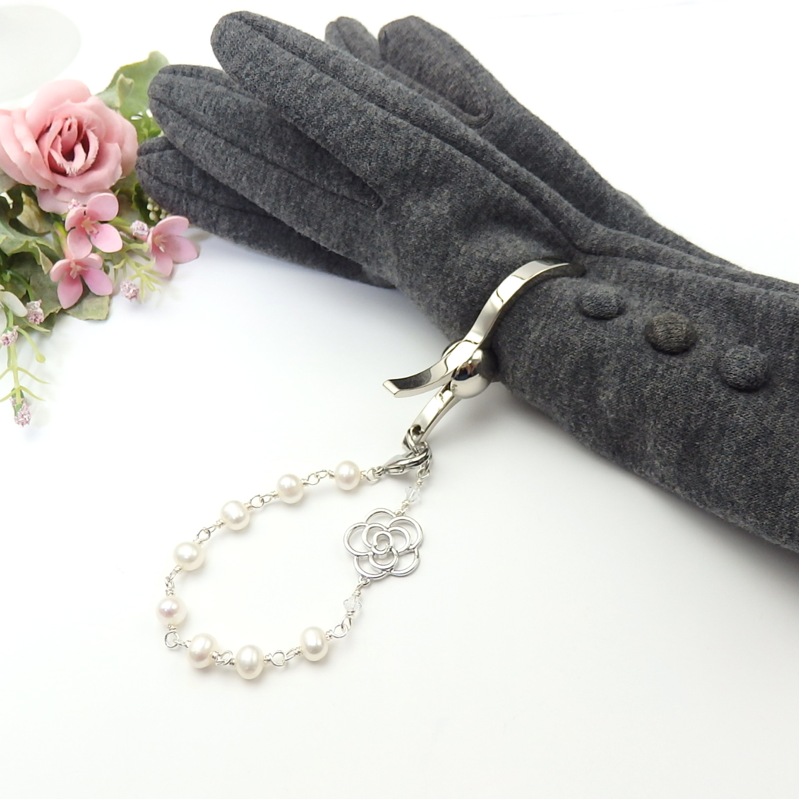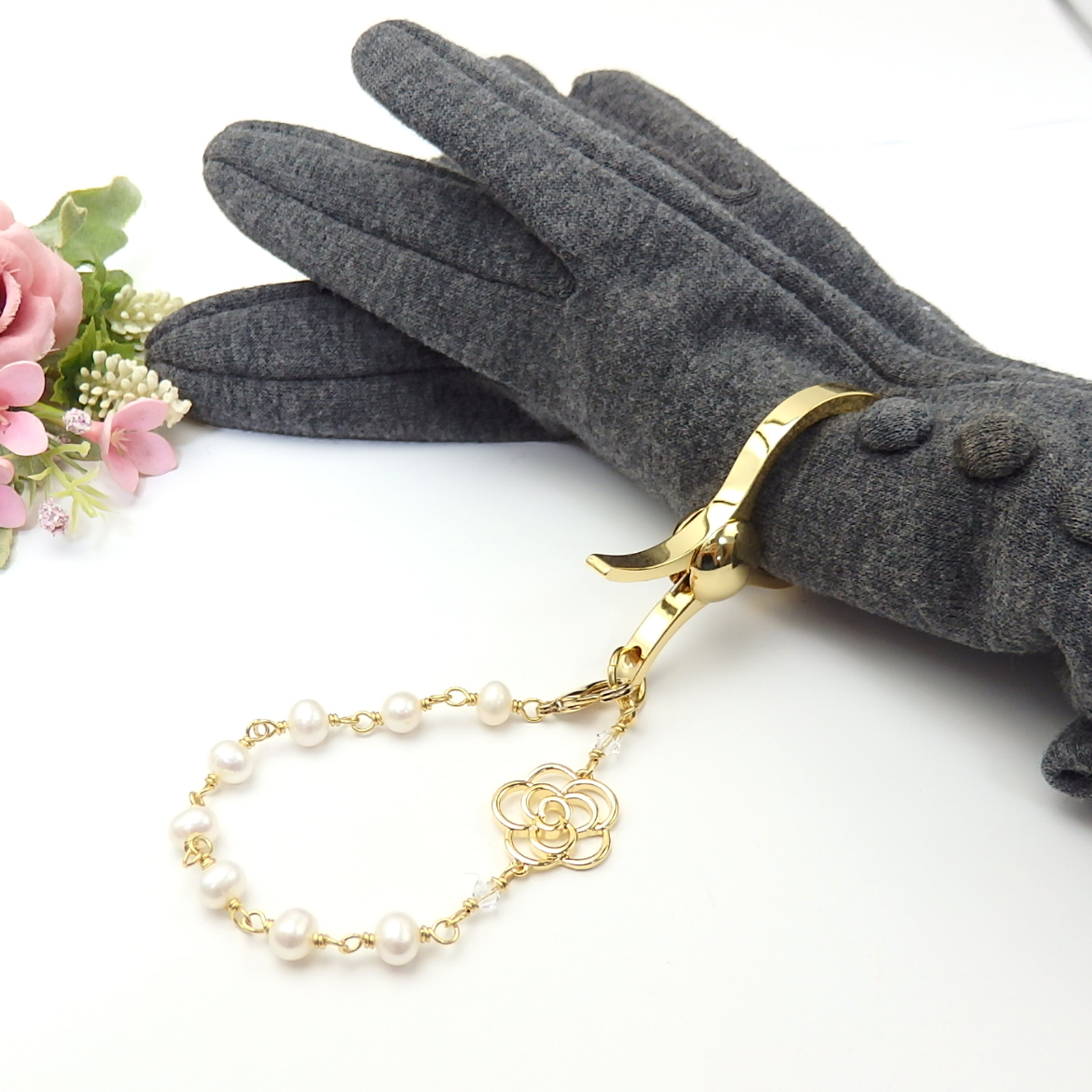 セレブなカメリアモチーフと大粒淡水パールとスワロフスキーがエレガントなグローブホルダー。