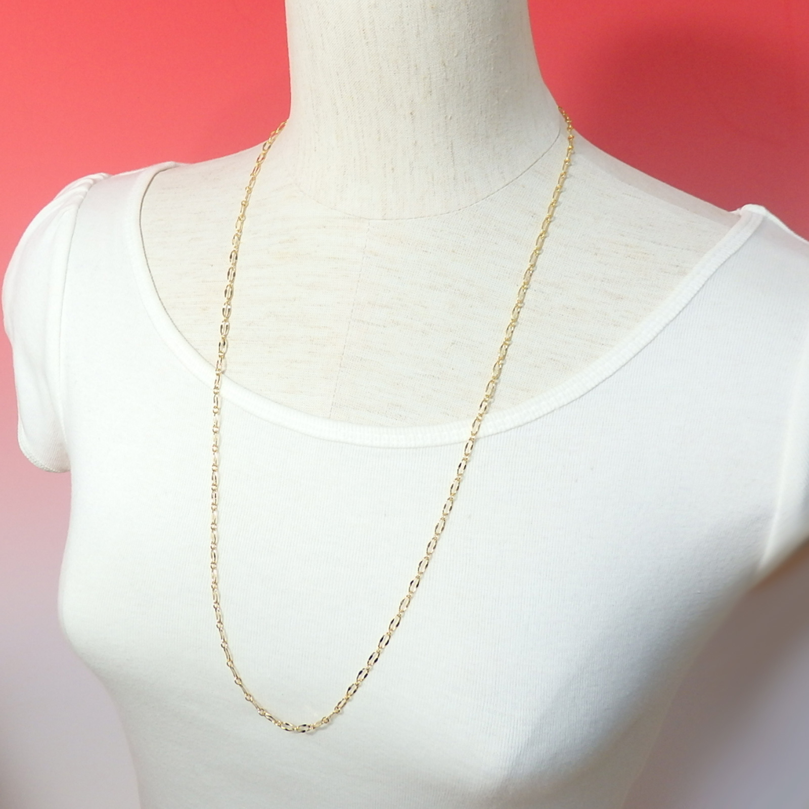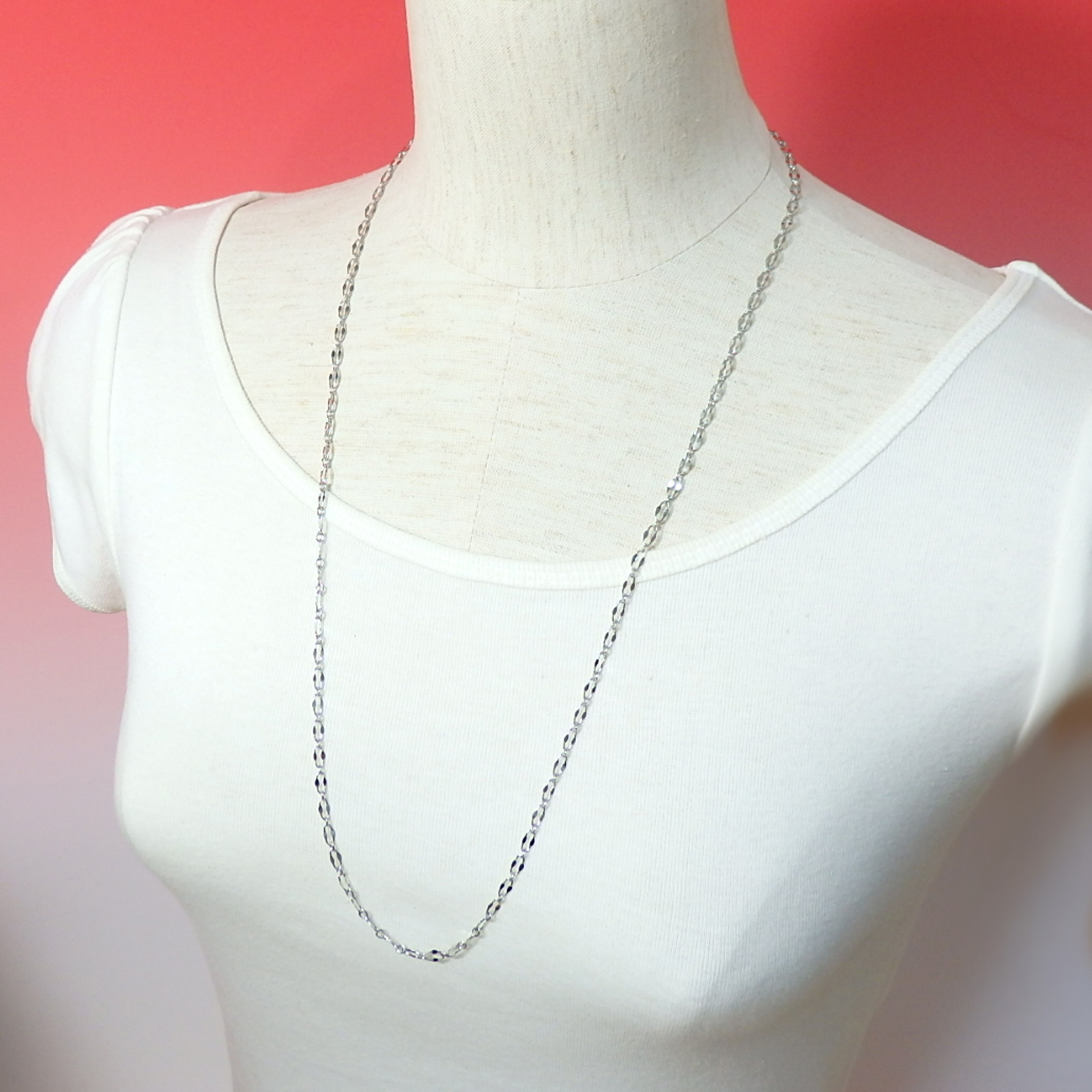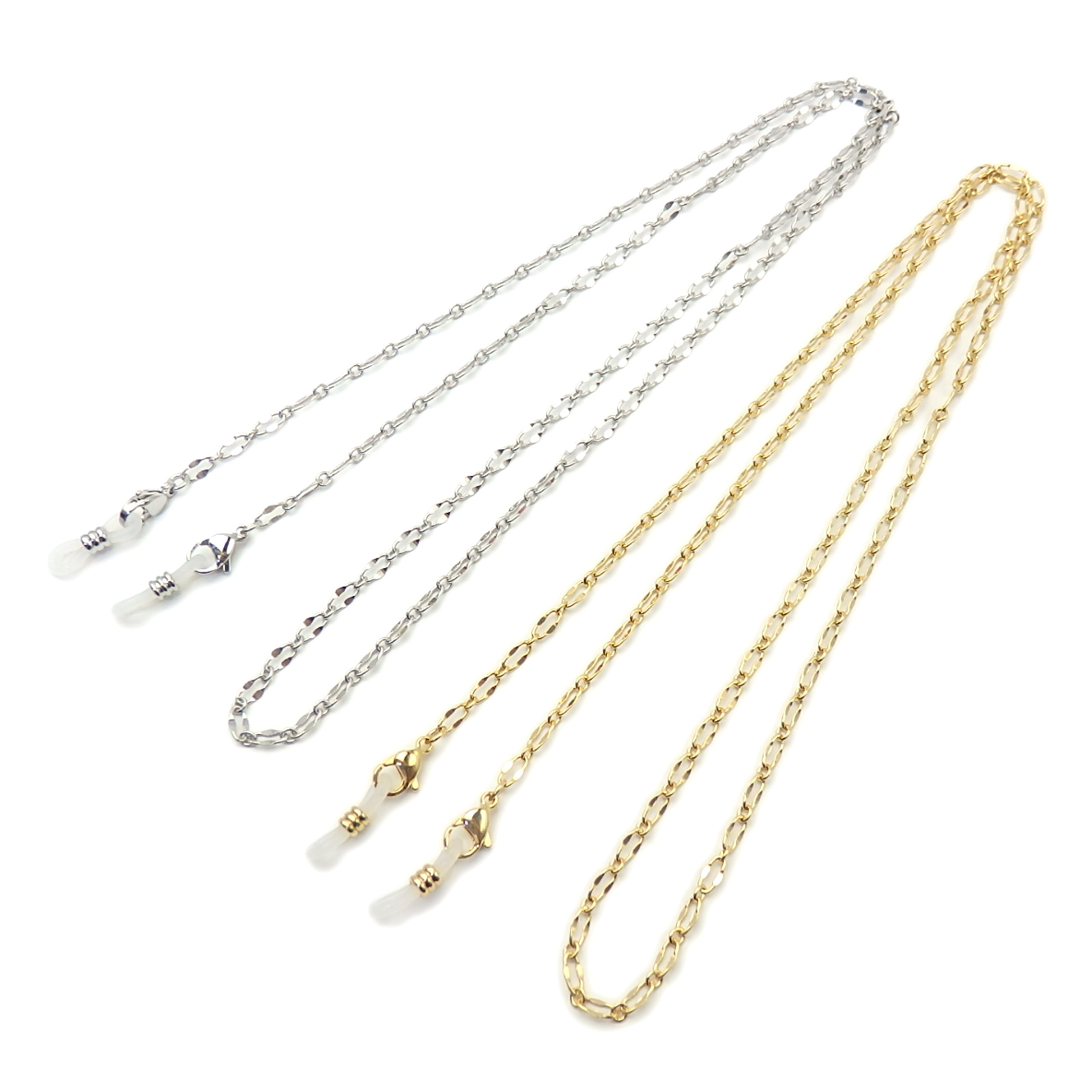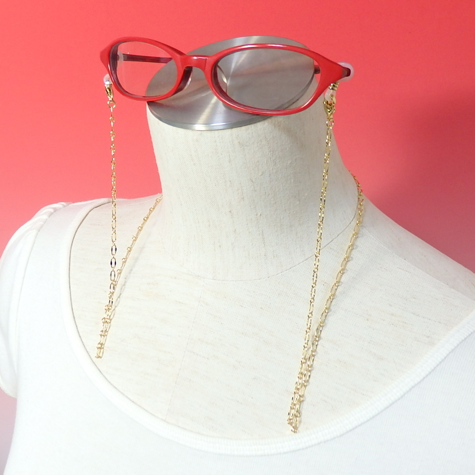 シンプルなフィガロチェーンにプレス加工が施されて、キラキラと光るエレガントチェーンを使用したメガネチェーンです。