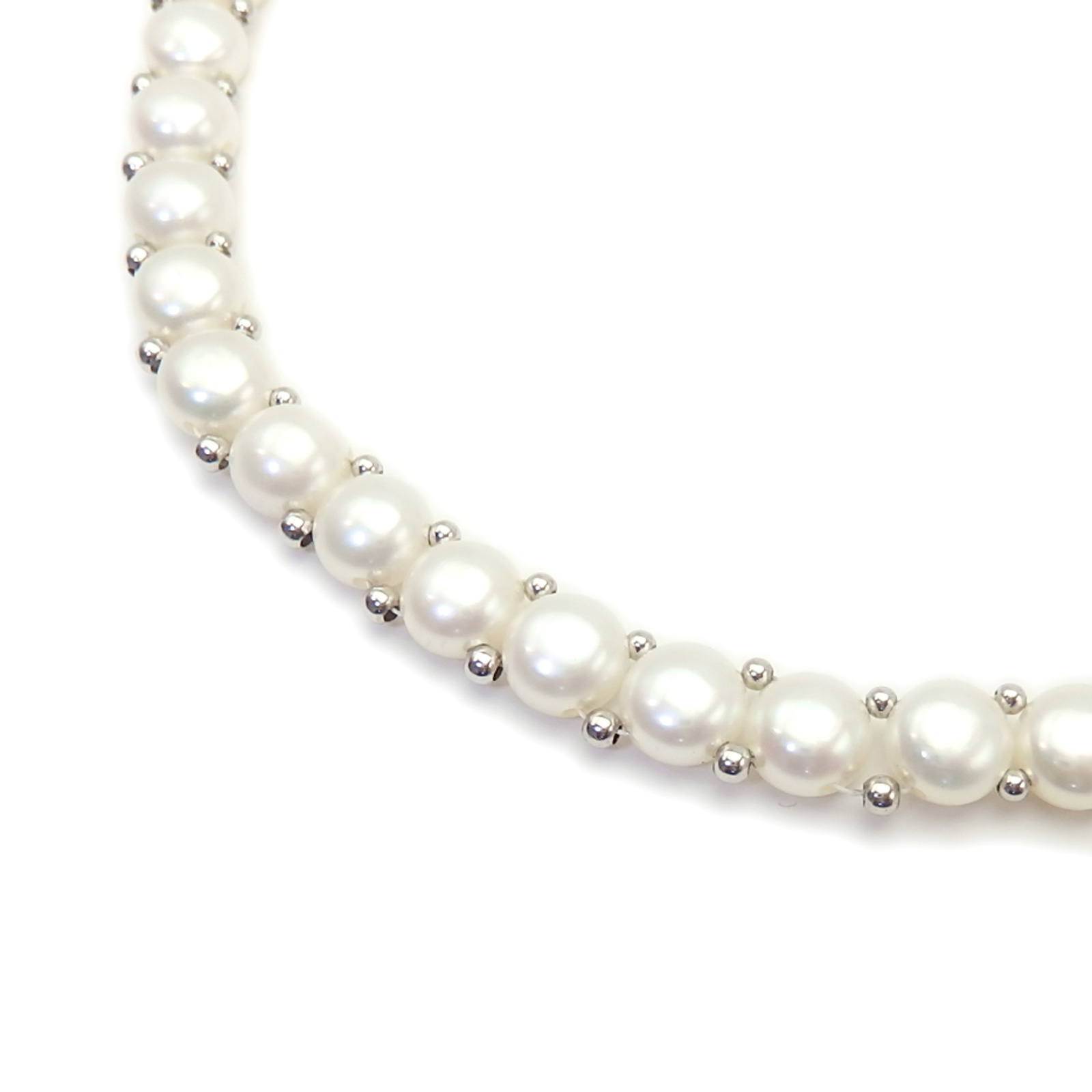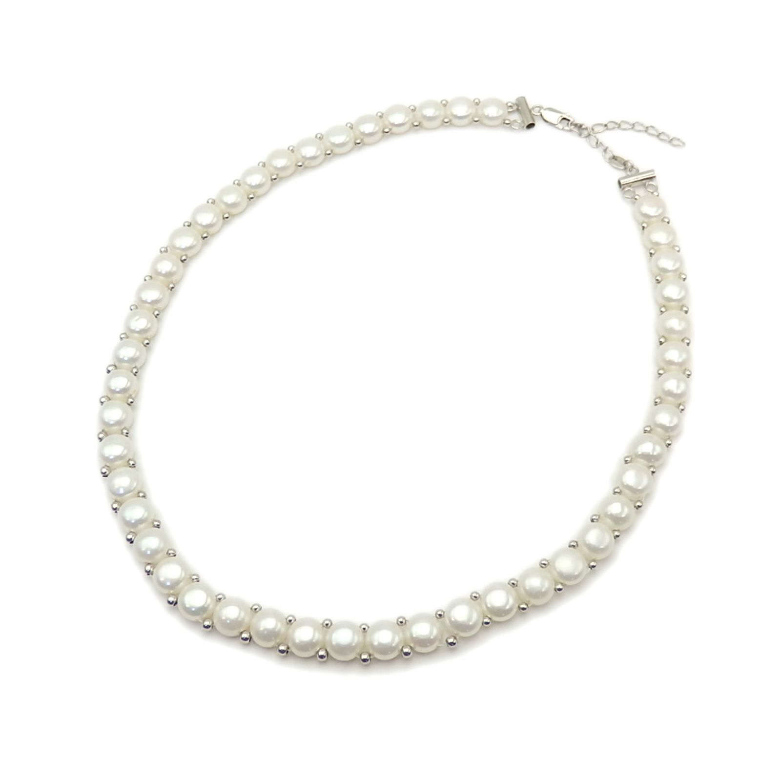 ホワイトのボタンパールとシルバービーズを編んだシンプルなチョーカーネックレスです。