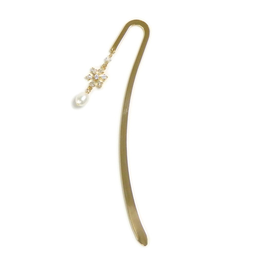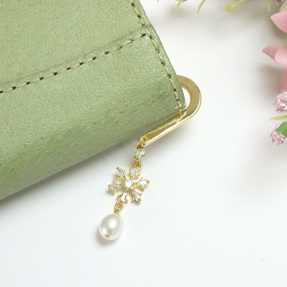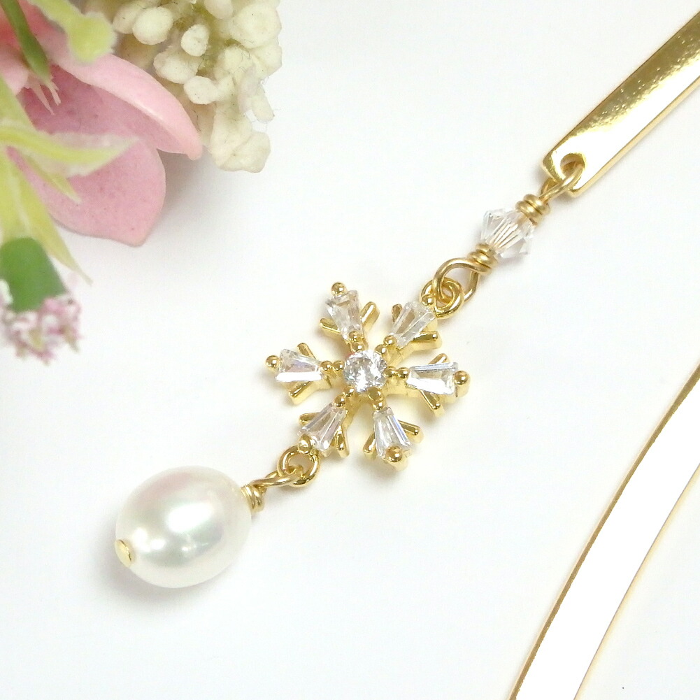 素材:メタルブックマーカー(真鍮)、キュービックジルコニア使用の雪の結晶メタルパーツ(約10×9mm)、淡水パール(約6mm)、スワロフスキー(3mm)